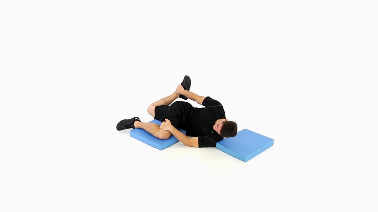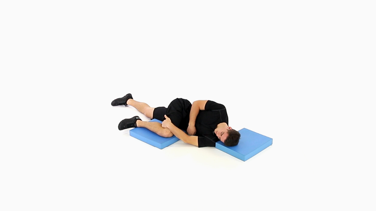 Set-up: Lie on either side with one knee up on a foam roll or pad to keep the hips stacked, the other down in a neutral position, and the head supported by a foam pad. Take the hand of the arm that is in contact with the ground and grab the knee that is flexed up at belly button height. Take the other hand and grab the ankle of the leg that is behind the back, while keeping the hip in extension. If it is too difficult to grab the ankle then use a towel or strap.