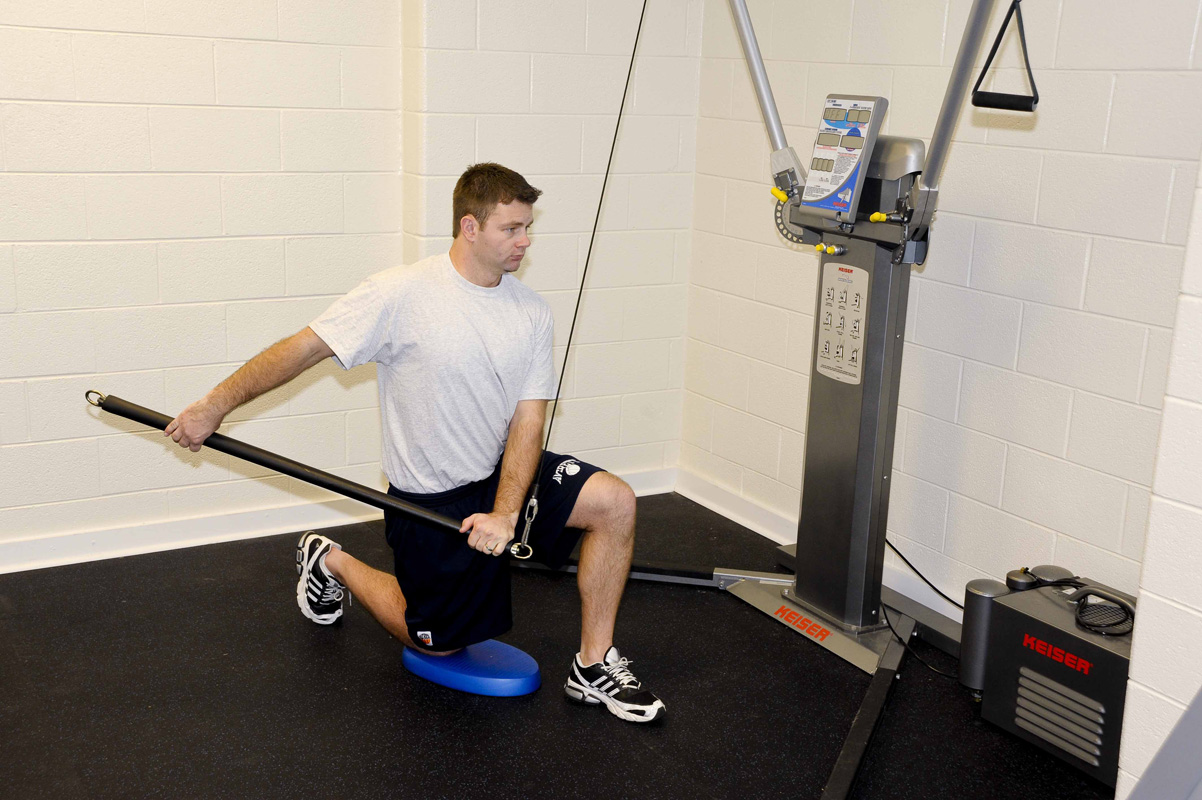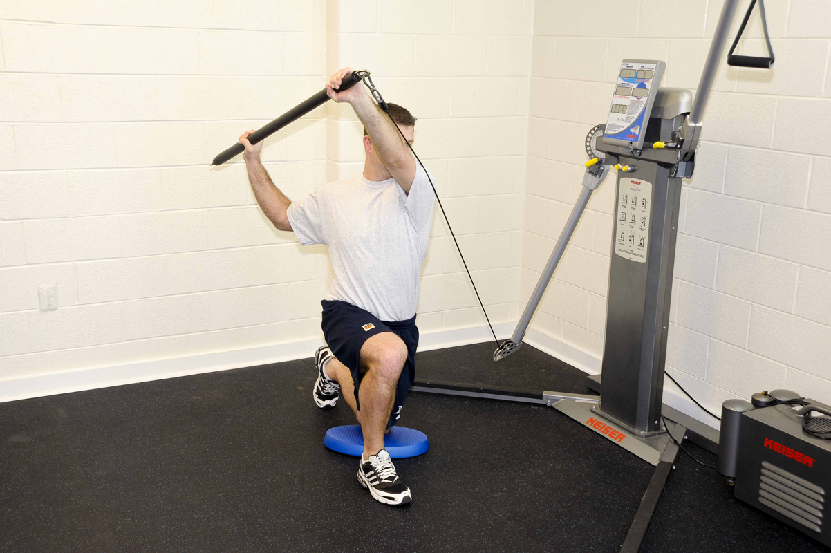 You can do the initial test a few different ways. One way is to get into an open area with a firm or hard surface and perform a chop bounce pass to the left and right 3 times each from half kneeling and tall kneeling positions. Mark and measure the distance the ball travels in the air after the first bounce, to the spot from where it was thrown. Look for left to right differences greater than 10 percent. If the greatest difference is observed in tall kneeling position, then work on the weaker side in that position. If the greatest difference is observed in half kneeling position, then work on the weaker side in that position. If a significant difference is not seen, than alternate your workout between tall kneeling and half kneeling throws equally to the right and left.