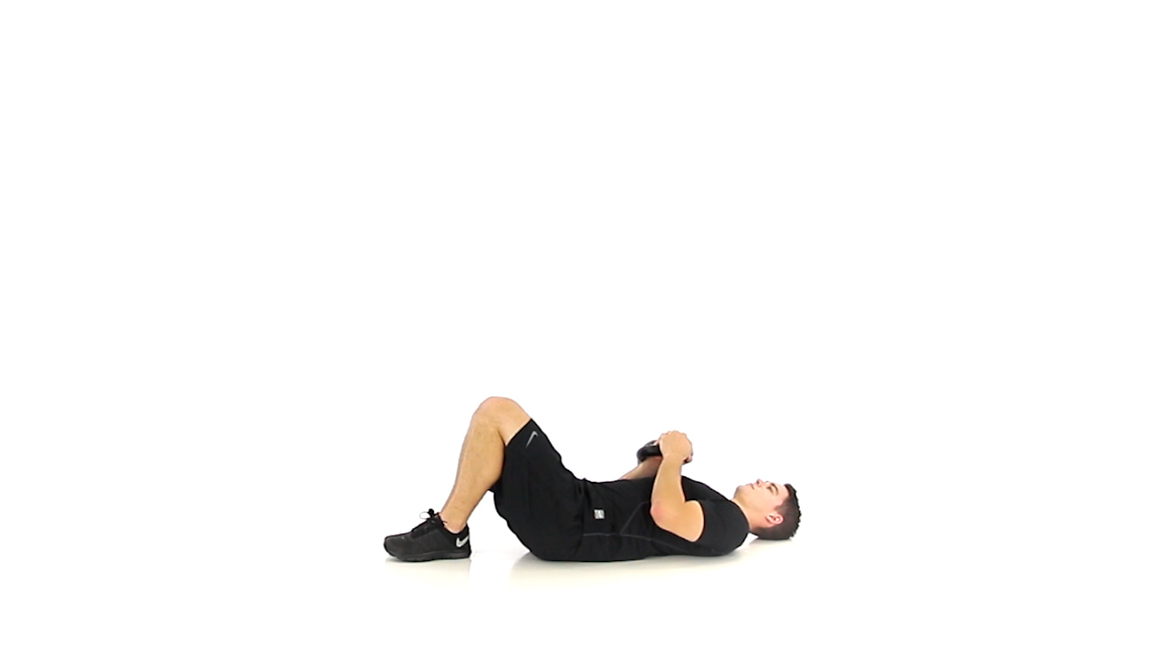 Begin in a side lying position beside the kettlbell. Grab the kettlbell with one hand underneath the handle and the other hand on top of the kettlebell. Then proceed to roll over into a supine position with the kettlebell resting on the abdomen.