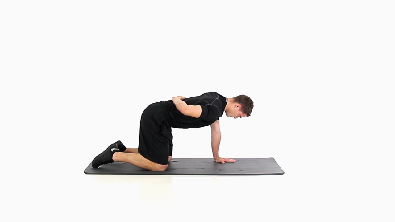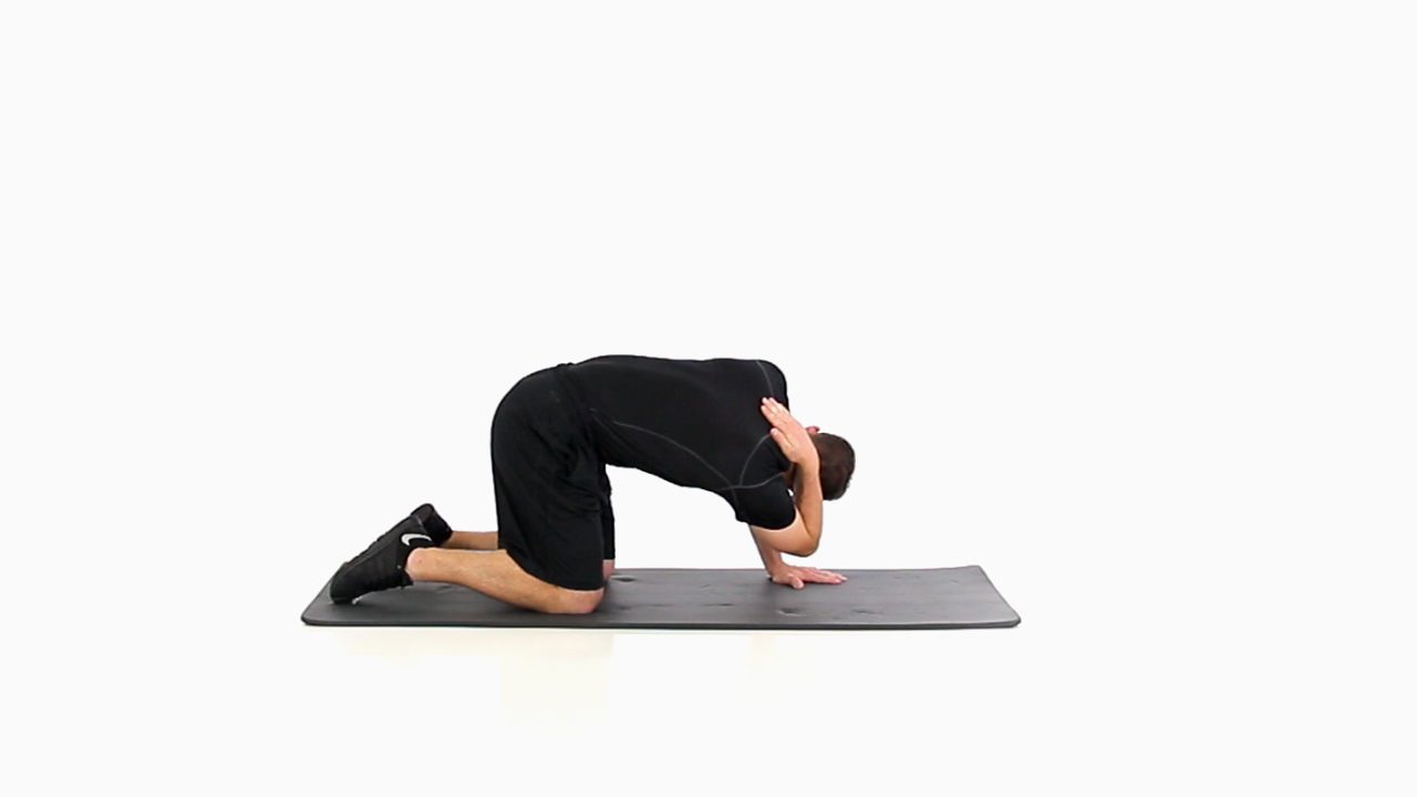 Setup: Get into a quadruped position with the knees under the hips and the hands under the shoulders with the spine in a neutral position. For the first position, place one hand on the upper back or back of the neck. Do not pull down or put pressure into neck with hand.