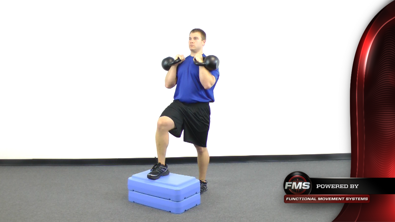 This is an advanced lunge movement performed with weights held in the rack position and challenges strength and proprioception in this pattern.