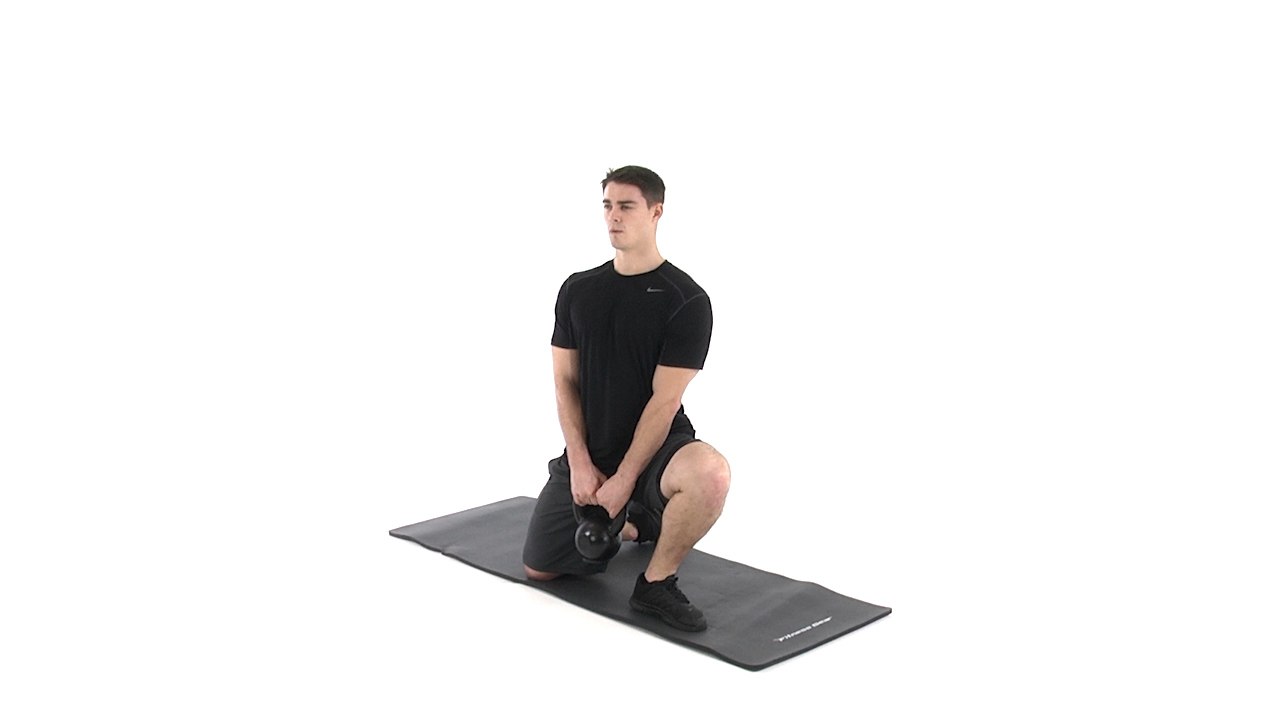 Setup: Get into the half kneeling posture by placing one knee down directly under the hip and the other foot should be in line with the knee, this will create the 90/90 position. Next open up your hip so that the ankle is in line with the knee creating a right angle. Once the beginning position has been accomplished, grab the kettlebell with both hands.