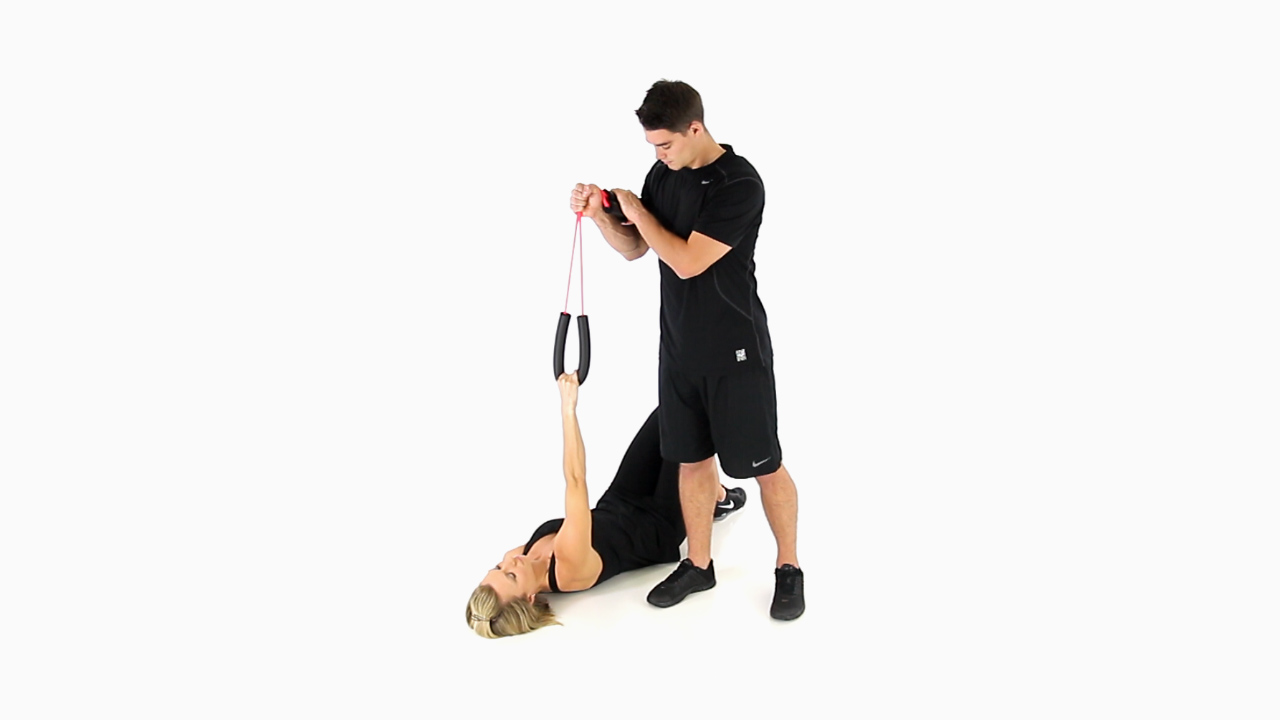 While lying flat on your back extend one arm and hold the FMT band with a relaxed shoulder and a relaxed grip. Then simultaneously pull the shoulder blade down toward your lower body and firmly grip the foam on the FMT band. The muscles around the shoulder should create a solid connection between the extended arm and the torso. With a neutral neck and head position, keep maximal distance between the ear and the shoulder.